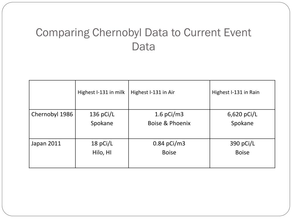 EPA Region 10 Effort • Fixed RadNet Units: • Alaska (Juneau, Fairbanks, Anchorage) • Idaho (Boise) • Oregon (Portland, Corvallis) • Washington (Olympia, Spokane, Richland) • Deployable Units: • Alaska (*Dutch Harbor, *Nome, *Juneau) • *Boise