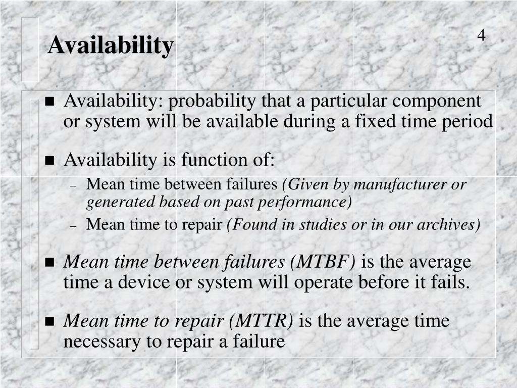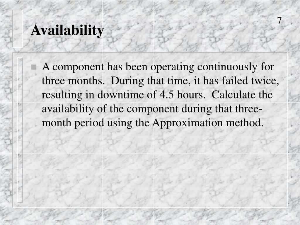 Availability • A component has been operating continuously for three months. During that time, it has failed twice, resulting in downtime of 4.5 hours. Calculate the availability of the component during that three-month period using the Approximation method.