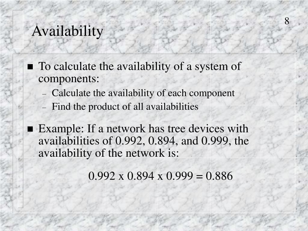 Availability • To calculate the availability of a system of components: • Calculate the availability of each component • Find the product of all availabilities • Example: If a network has tree devices with availabilities of 0.992, 0.894, and 0.999, the availability of the network is: 0.992 x 0.894 x 0.999 = 0.886