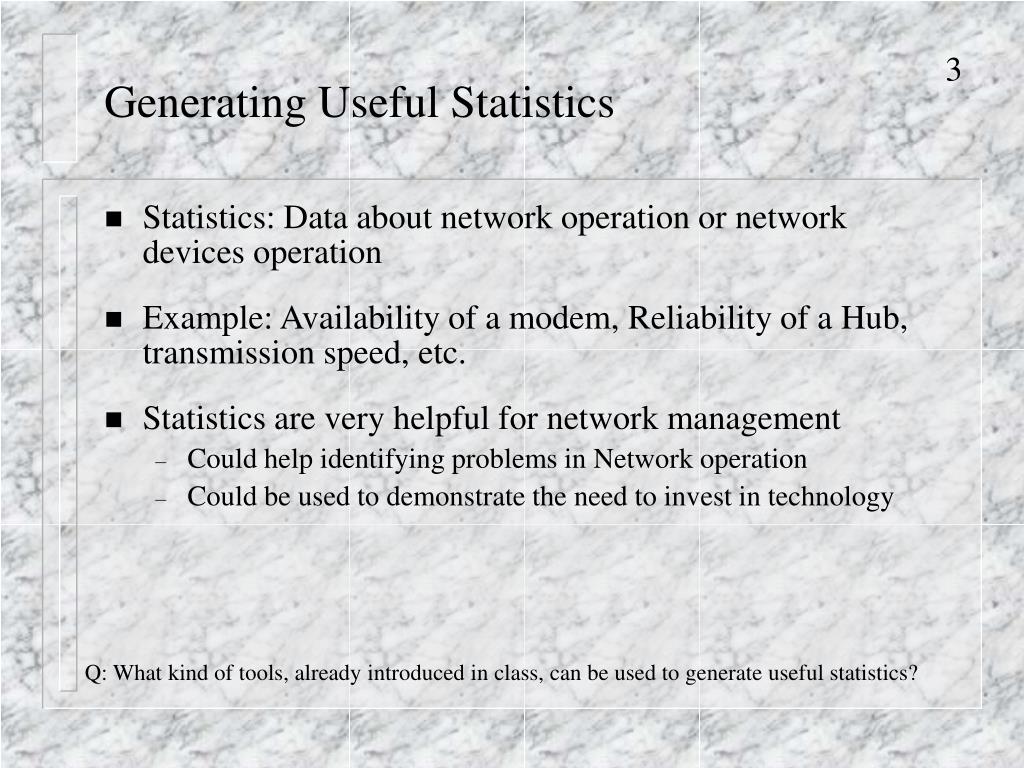 Generating Useful Statistics • Statistics: Data about network operation or network devices operation • Example: Availability of a modem, Reliability of a Hub, transmission speed, etc. • Statistics are very helpful for network management • Could help identifying problems in Network operation • Could be used to demonstrate the need to invest in technology Q: What kind of tools, already introduced in class, can be used to generate useful statistics?