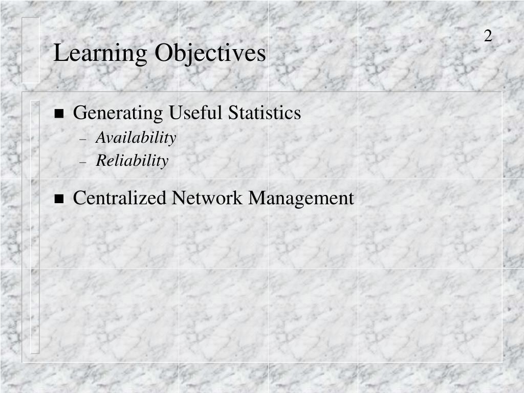Learning Objectives • Generating Useful Statistics • Availability • Reliability • Centralized Network Management