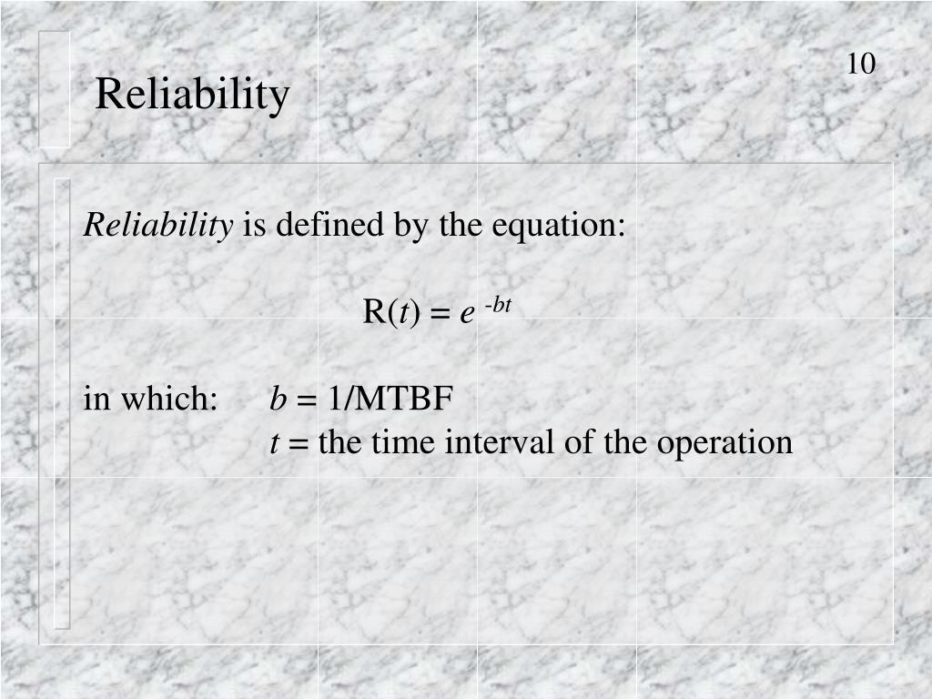 Reliability • Reliability is defined by the equation: • R(t) = e-bt • in which: b = 1/MTBF • t = the time interval of the operation