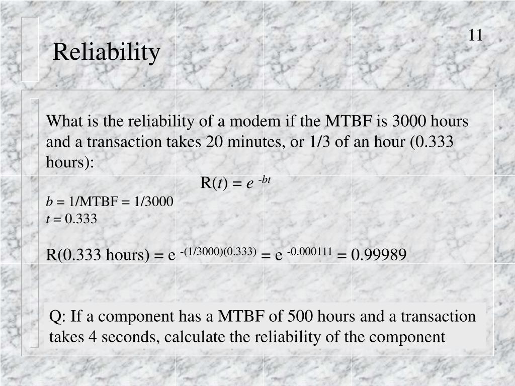 Reliability What is the reliability of a modem if the MTBF is 3000 hours and a transaction takes 20 minutes, or 1/3 of an hour (0.333 hours): R(t) = e-bt b = 1/MTBF = 1/3000 t = 0.333 R(0.333 hours) = e -(1/3000)(0.333) = e -0.000111 = 0.99989 Q: If a component has a MTBF of 500 hours and a transaction takes 4 seconds, calculate the reliability of the component