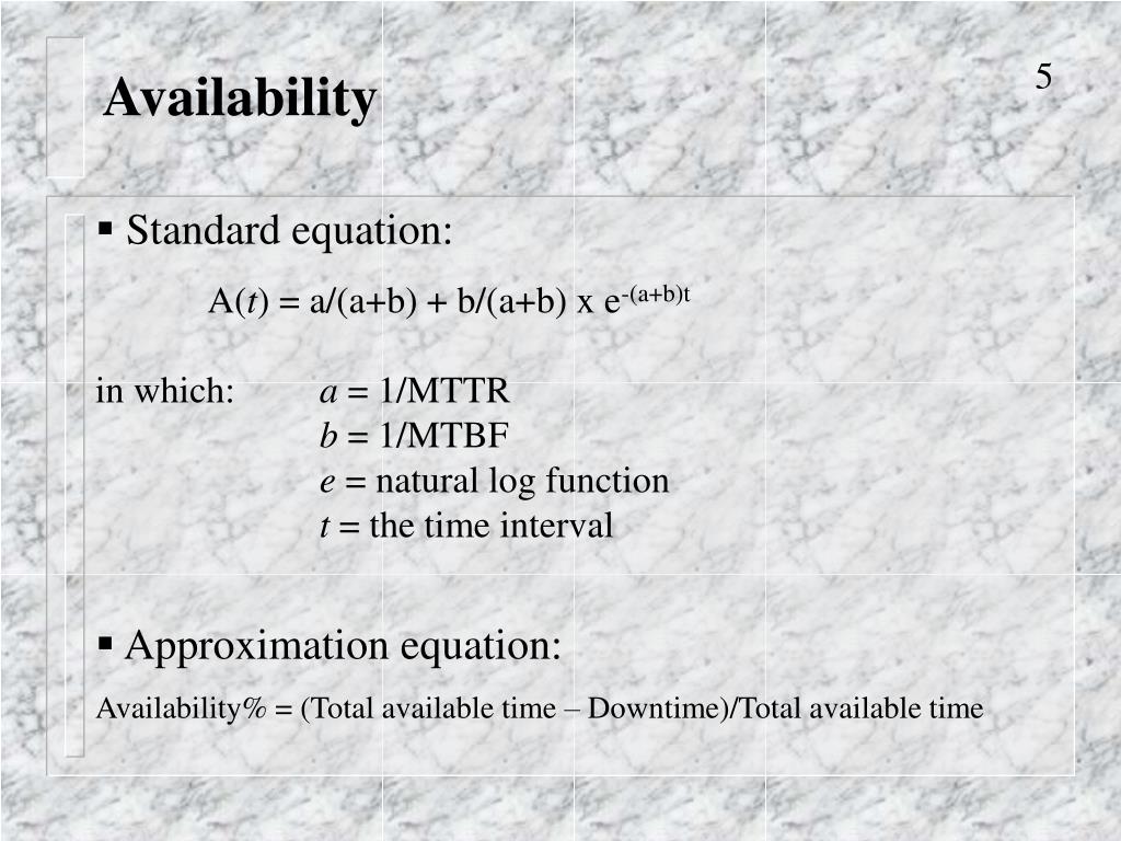 Availability • Standard equation: • A(t) = a/(a+b) + b/(a+b) x e-(a+b)t • in which: a = 1/MTTR • b = 1/MTBF • e = natural log function • t = the time interval • Approximation equation: • Availability% = (Total available time – Downtime)/Total available time