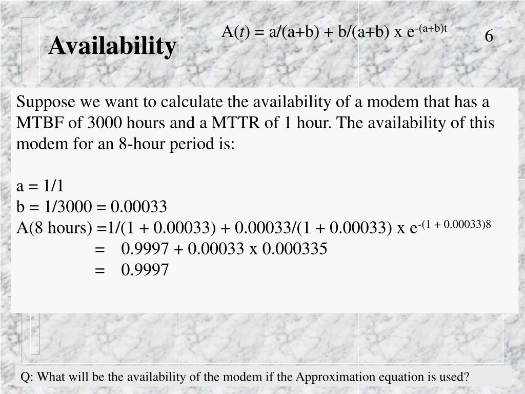 A(t) = a/(a+b) + b/(a+b) x e-(a+b)t Availability Suppose we want to calculate the availability of a modem that has a MTBF of 3000 hours and a MTTR of 1 hour. The availability of this modem for an 8-hour period is: a = 1/1 b = 1/3000 = 0.00033 A(8 hours) =1/(1 + 0.00033) + 0.00033/(1 + 0.00033) x e-(1 + 0.00033)8 = 0.9997 + 0.00033 x 0.000335 = 0.9997 Q: What will be the availability of the modem if the Approximation equation is used?