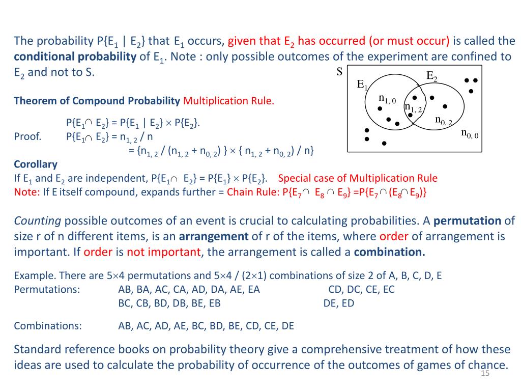 The probability P{E1 | E2} thatE1 occurs, given that E2 has occurred (or must occur) is called the conditional probability of E1. Note : only possible outcomes of the experiment are confined to E2 and not to S.Theorem of Compound ProbabilityMultiplication Rule.P{E1 E2} = P{E1 | E2} P{E2}.Proof. P{E1 E2} = n1, 2 / n = {n1, 2 / (n1, 2 + n0, 2) } { n1, 2 + n0, 2) / n} CorollaryIf E1 and E2 are independent, P{E1 E2} = P{E1} P{E2}. Special caseof Multiplication RuleNote: If Eitself compound, expands further = Chain Rule: P{E7E8 E9} =P{E7 (E8 E9)}Countingpossible outcomes of an event is crucial to calculating probabilities.Apermutation of size r of n different items, is an arrangement of r of the items, where orderof arrangement is important. If orderis not important, the arrangement is called a combination.Example. There are 54 permutations and 54 / (21) combinations of size 2 of A, B, C, D, EPermutations: AB, BA, AC, CA, AD, DA, AE, EACD, DC, CE, EC BC, CB, BD, DB, BE, EBDE, EDCombinations: AB, AC, AD, AE, BC, BD, BE, CD, CE, DEStandard reference books on probability theory give a comprehensive treatment of how these ideas are used to calculate the probability of occurrence of the outcomes of games of chance. S E2 E1 n1, 0 n1, 2 n0, 2 n0, 0
