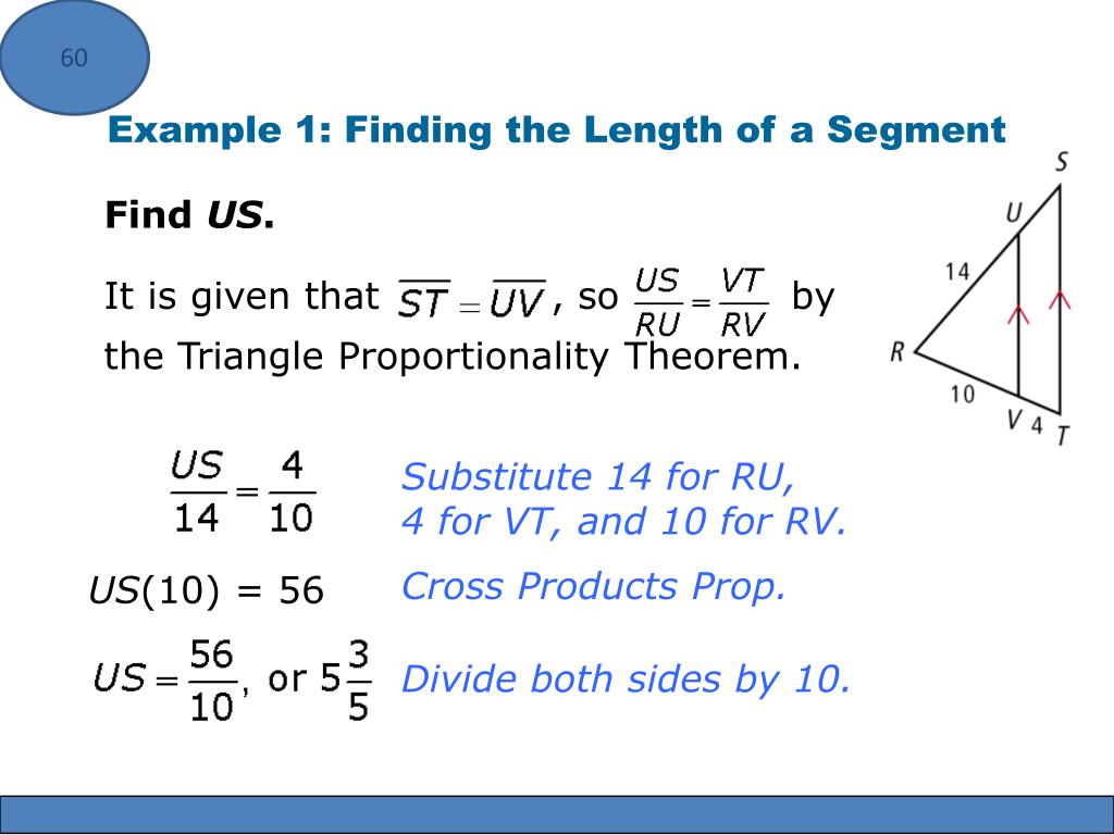 60 It is given that , so by the Triangle Proportionality Theorem. Example 1: Finding the Length of a Segment Find US. Substitute 14 for RU, 4 for VT, and 10 for RV. Cross Products Prop. US(10) = 56 Divide both sides by 10.