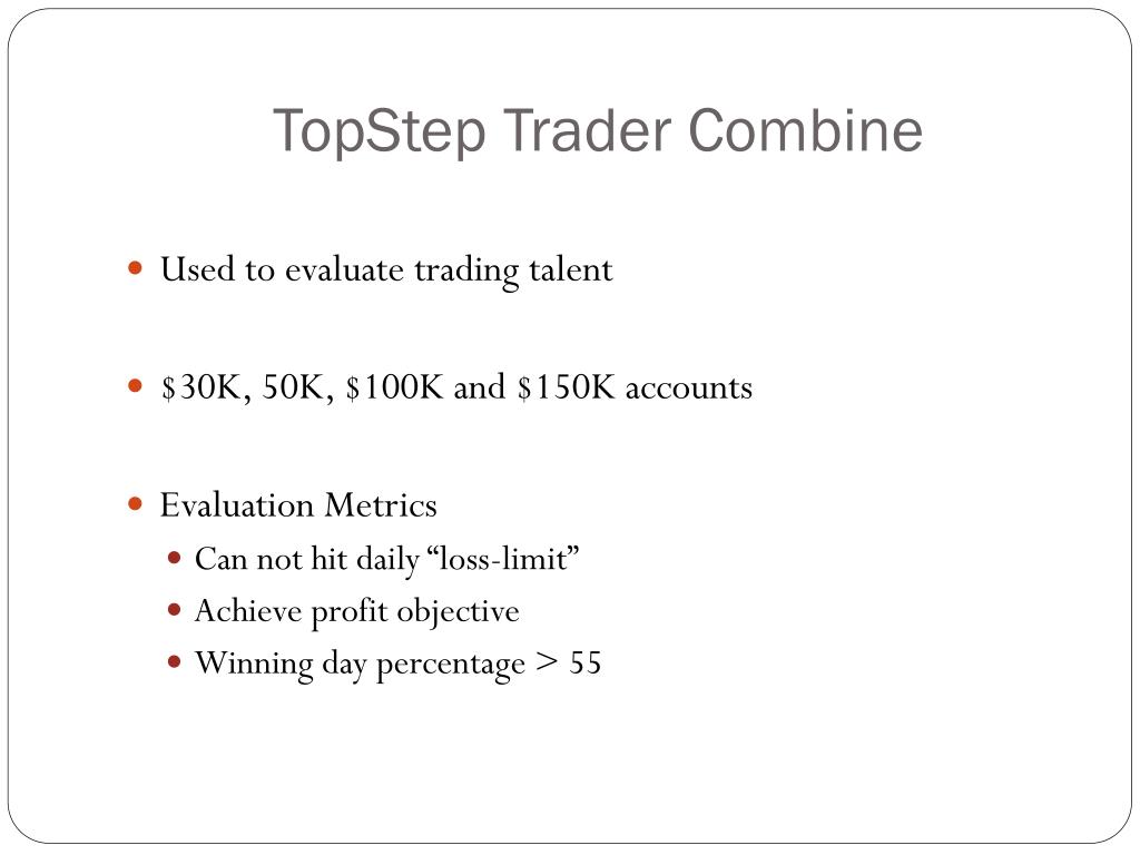 TopStep Trader Combine • Used to evaluate trading talent • $30K, 50K, $100K and $150K accounts • Evaluation Metrics • Can not hit daily “loss-limit” • Achieve profit objective • Winning day percentage > 55