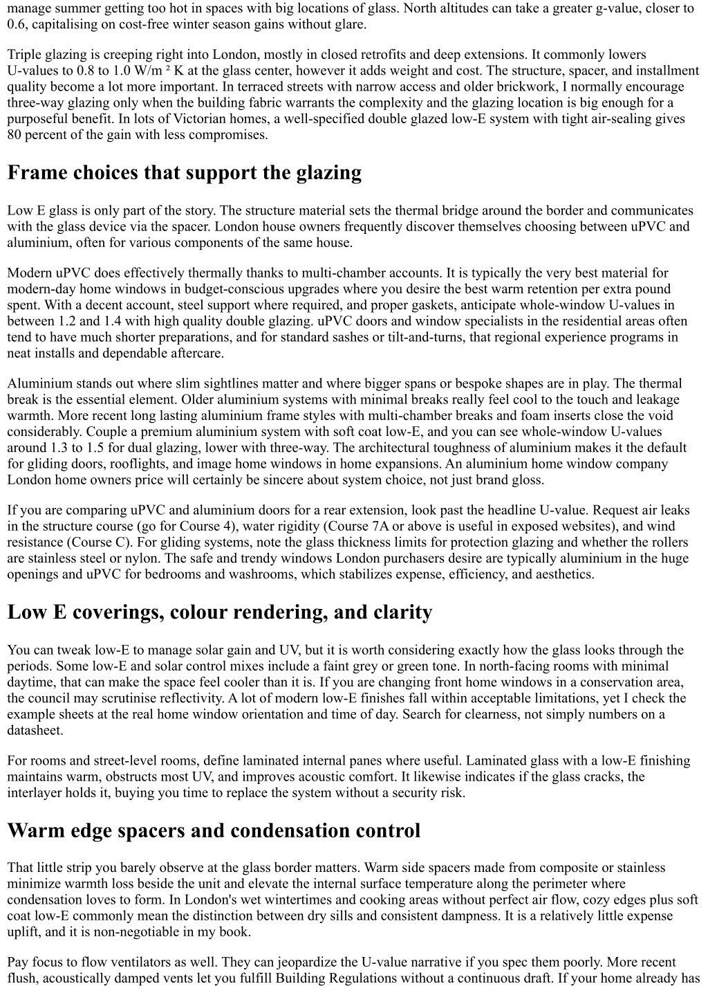 Walk any type of London street and you can review the city's past in its home windows. Sash frames in Georgian balconies, steel sashes in interwar residences, slim aluminium in transformed stockrooms, uPVC replacements in rural semis. Each era picked what looked right and what was readily available. Now the criterion most London homeowners add to that checklist is performance. Power costs and thermal comfort issue, which is where low‑E coatings, good glazing build‑ups, and practical frame selections earn their keep. This guide unboxes just how low‑E glass operates in our climate, why specific glazing combinations outperform others in main and outer London, and just how to pick in between uPVC and aluminium without falling for marketing faster ways. I'll also share functional installment notes from real projects, particularly for house expansions where you may be mixing traditional facades with contemporary windows. What low‑E actually does in a London context Low E means reduced emissivity. The glass brings a microscopically thin, transparent steel oxide layer that mirrors long‑wave infrared power. In plain terms, it assists keep warmth where you desire it: inside in wintertime, outside in summertime. The elegance is that the finish does this without turning your home window right into a mirror, supplied you pick the appropriate specification. There are two major kinds you'll satisfy when talking with a London dual glazing business. Soft coat low‑E, also called sputter layer, is applied in a vacuum chamber and secured within a shielding glass device. It supplies higher efficiency with U‑values from regarding 1.0 to 1.4 W/m ² K in dual glazing, reduced still in three-way. Difficult coat low‑E is pyrolytic, baked onto the glass during manufacture, and is extra robust to dealing with but less reliable, with common double glazed U‑values around 1.6 to 1.8. Our warm losses in London are dominated by winter season. Older residences can shed 10 to 25 percent of their warm with home windows, more if you have solitary glazing and leaky frameworks. A soft layer low‑E on the cavity face, coupled with argon fill, can reduce that loss in half. You will feel the difference in surface area temperature. With common double glazing, an internal pane on a cold January evening might sit at 9 to 11 ° C if the room is 20 ° C. The very same home window with a high‑performance soft coat and warm side spacer usually measures 14 to 16 ° C. That five‑degree lift pulls the space away from that familiar perimeter chill. Choosing the right glazing build‑up for our weather London's climate offers us moderate winter seasons by continental criteria, constant wind and driving rain, and summer season heat that currently pushes indoor temperatures uncomfortably high during heatwaves. A great low‑E option balances wintertime U‑value and summer solar gain control. Double glazing with a 28 mm overall depth, typically 4‑20‑4, remains the workhorse. With soft coat low‑E, argon, and a cozy edge spacer, you can hit a whole‑window U‑value around 1.2 to 1.4, depending upon framework. Acoustic efficiency enhances with crookedness, for example 4‑16‑6.8 laminated flooring, which likewise includes safety. For southern and western altitudes, consider a solar control variation of low‑E with a g‑value in between 0.35 and 0.5 to