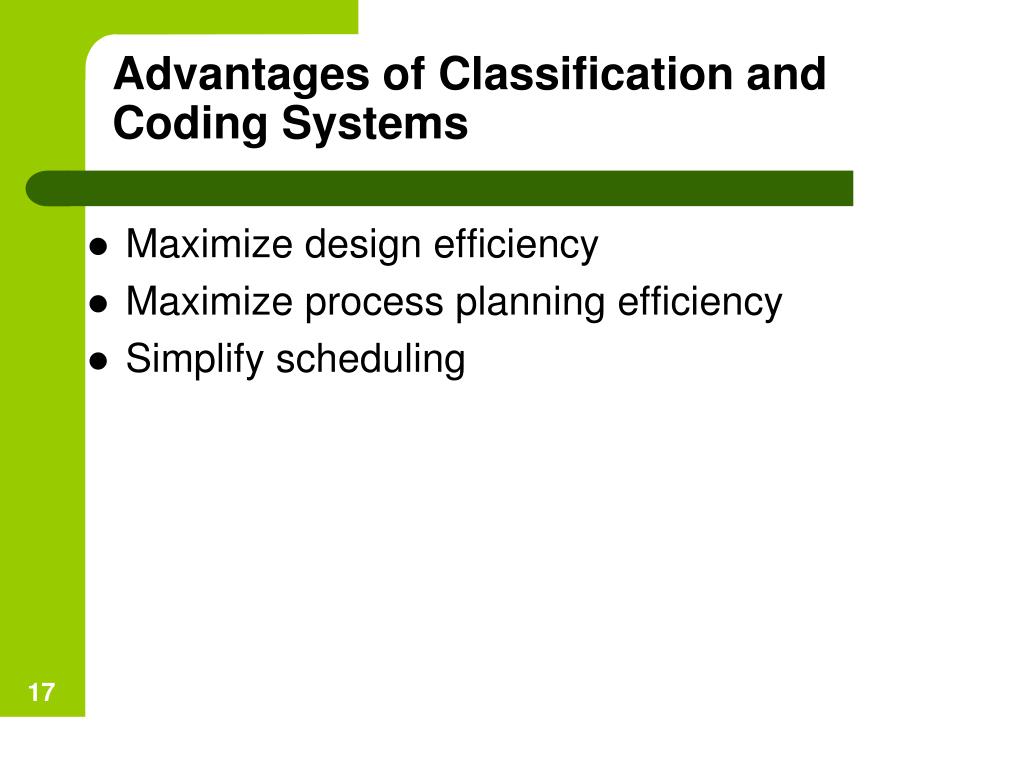 Advantages of Classification and Coding Systems • Maximize design efficiency • Maximize process planning efficiency • Simplify scheduling