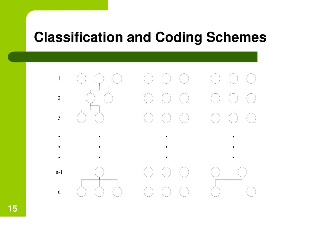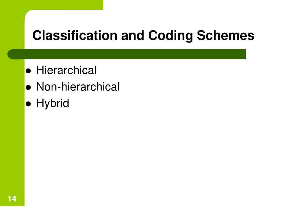 Classification and Coding Schemes • Hierarchical • Non-hierarchical • Hybrid