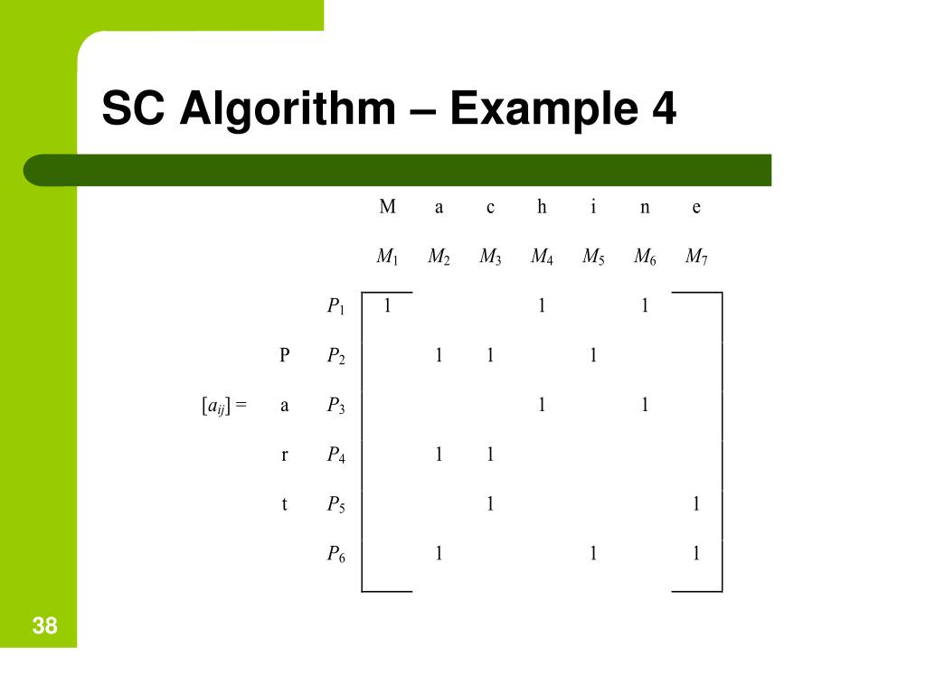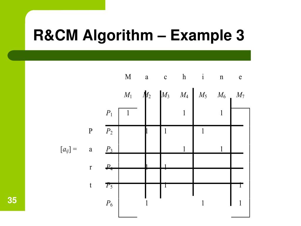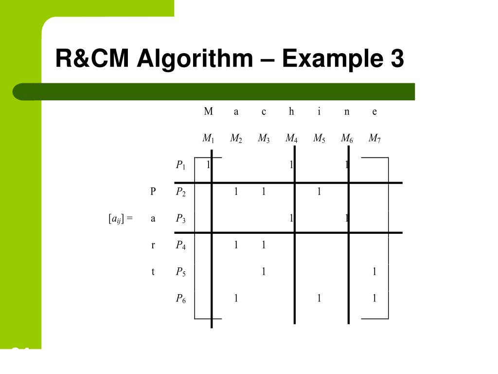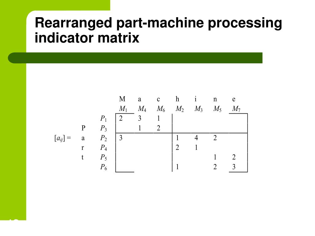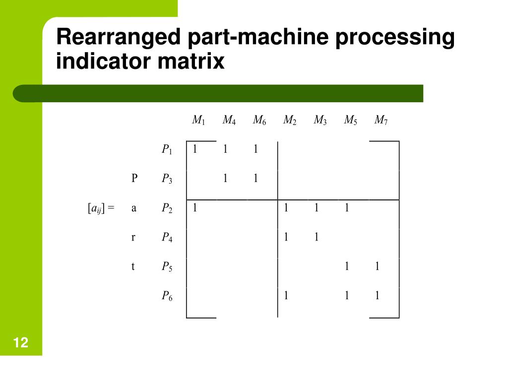 Row and Column Masking Algorithm Step 1: Draw a horizontal line through the first row. Select any 1 entry in the matrix through which there is only one line. Step 2: If the entry has a horizontal line, go to step 2a. If the entry has a vertical line, go to step 2b. Step 2a: Draw a vertical line through the column in which this 1 entry appears. Go to step 3. Step 2b: Draw a horizontal line through the row in which this 1 entry appears. Go to step 3. Step 3:If there are any 1 entries with only one line through them, select any one and go to step 2. Repeat until there are no such entries left. Identify the corresponding machine cell and part family. Go to step 4. Step 4: Select any row through which there is no line. If there are no such rows, STOP. Otherwise draw a horizontal line through this row, select any 1 entry in the matrix through which there is only one line and go to Step 2.