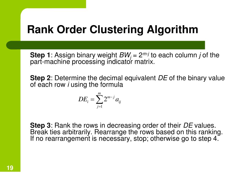 Rank Order Clustering Algorithm Step 1: Assign binary weight BWj = 2m-j to each column j of the part-machine processing indicator matrix. Step 2: Determine the decimal equivalent DE of the binary value of each row i using the formula Step 3: Rank the rows in decreasing order of their DE values. Break ties arbitrarily. Rearrange the rows based on this ranking. If no rearrangement is necessary, stop; otherwise go to step 4.