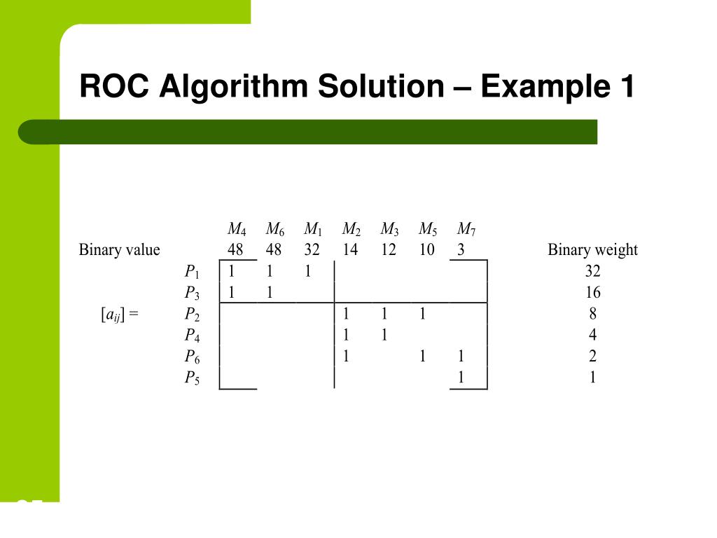 Rank Order Clustering Algorithm Step 4: For each rearranged row of the matrix, assign binary weight BWi = 2n-i. Step 5: Determine the decimal equivalent of the binary value of each column j using the formula Step 6: Rank the columns in decreasing order of their DE values. Break ties arbitrarily. Rearrange the columns based on this ranking. If no rearrangement is necessary, stop; otherwise go to step 1.