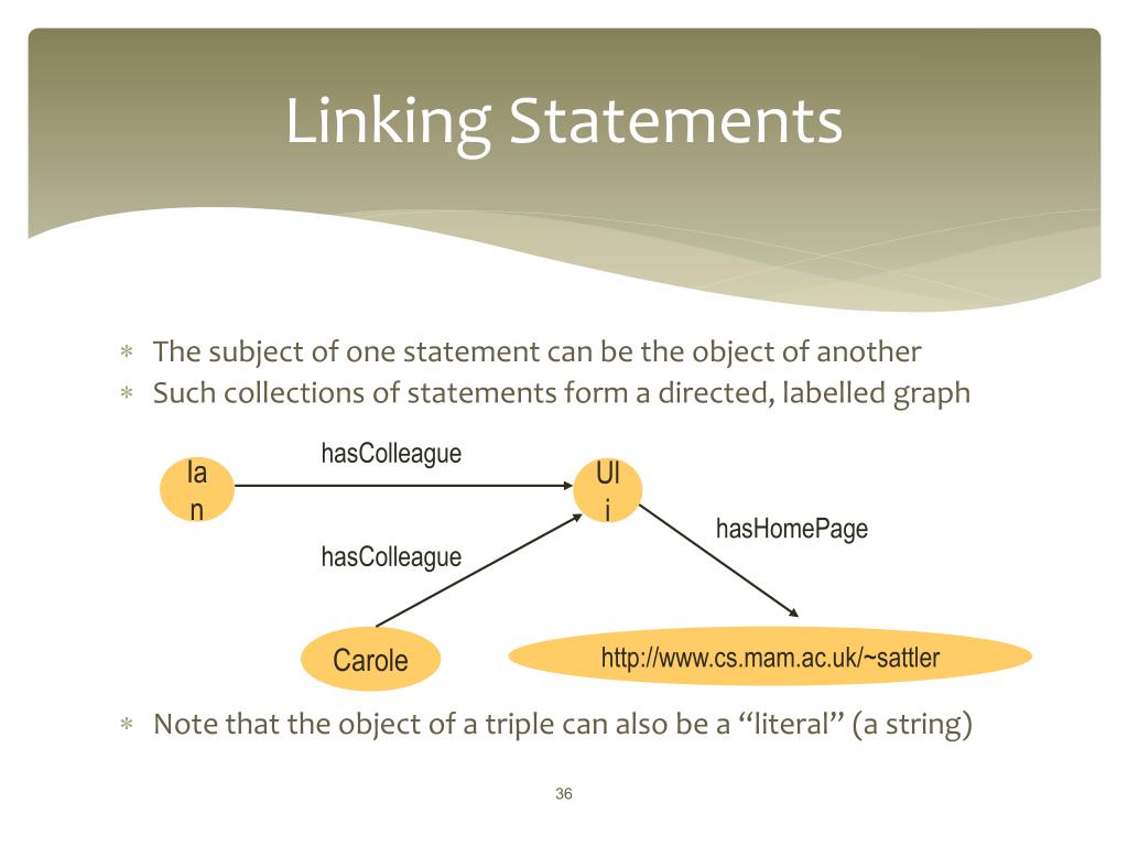 hasColleague Ian Uli hasHomePage hasColleague http://www.cs.mam.ac.uk/~sattler Carole Linking Statements • The subject of one statement can be the object of another • Such collections of statements form a directed, labelled graph • Note that the object of a triple can also be a “literal” (a string)