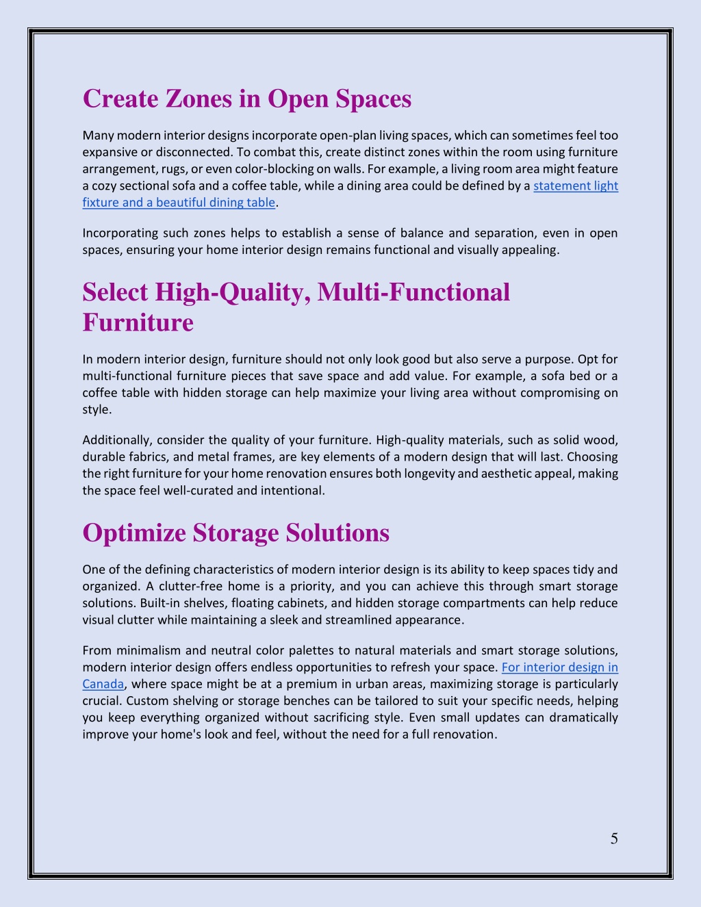 Create Zones in Open Spaces Many modern interior designs incorporate open-plan living spaces, which can sometimes feel too expansive or disconnected. To combat this, create distinct zones within the room using furniture arrangement, rugs, or even color-blocking on walls. For example, a living room area might feature a cozy sectional sofa and a coffee table, while a dining area could be defined by a statement light fixture and a beautiful dining table. Incorporating such zones helps to establish a sense of balance and separation, even in open spaces, ensuring your home interior design remains functional and visually appealing. Select High-Quality, Multi-Functional Furniture In modern interior design, furniture should not only look good but also serve a purpose. Opt for multi-functional furniture pieces that save space and add value. For example, a sofa bed or a coffee table with hidden storage can help maximize your living area without compromising on style. Additionally, consider the quality of your furniture. High-quality materials, such as solid wood, durable fabrics, and metal frames, are key elements of a modern design that will last. Choosing the right furniture for your home renovation ensures both longevity and aesthetic appeal, making the space feel well-curated and intentional. Optimize Storage Solutions One of the defining characteristics of modern interior design is its ability to keep spaces tidy and organized. A clutter-free home is a priority, and you can achieve this through smart storage solutions. Built-in shelves, floating cabinets, and hidden storage compartments can help reduce visual clutter while maintaining a sleek and streamlined appearance. From minimalism and neutral color palettes to natural materials and smart storage solutions, modern interior design offers endless opportunities to refresh your space. For interior design in Canada, where space might be at a premium in urban areas, maximizing storage is particularly crucial. Custom shelving or storage benches can be tailored to suit your specific needs, helping you keep everything organized without sacrificing style. Even small updates can dramatically improve your home's look and feel, without the need for a full renovation. 5