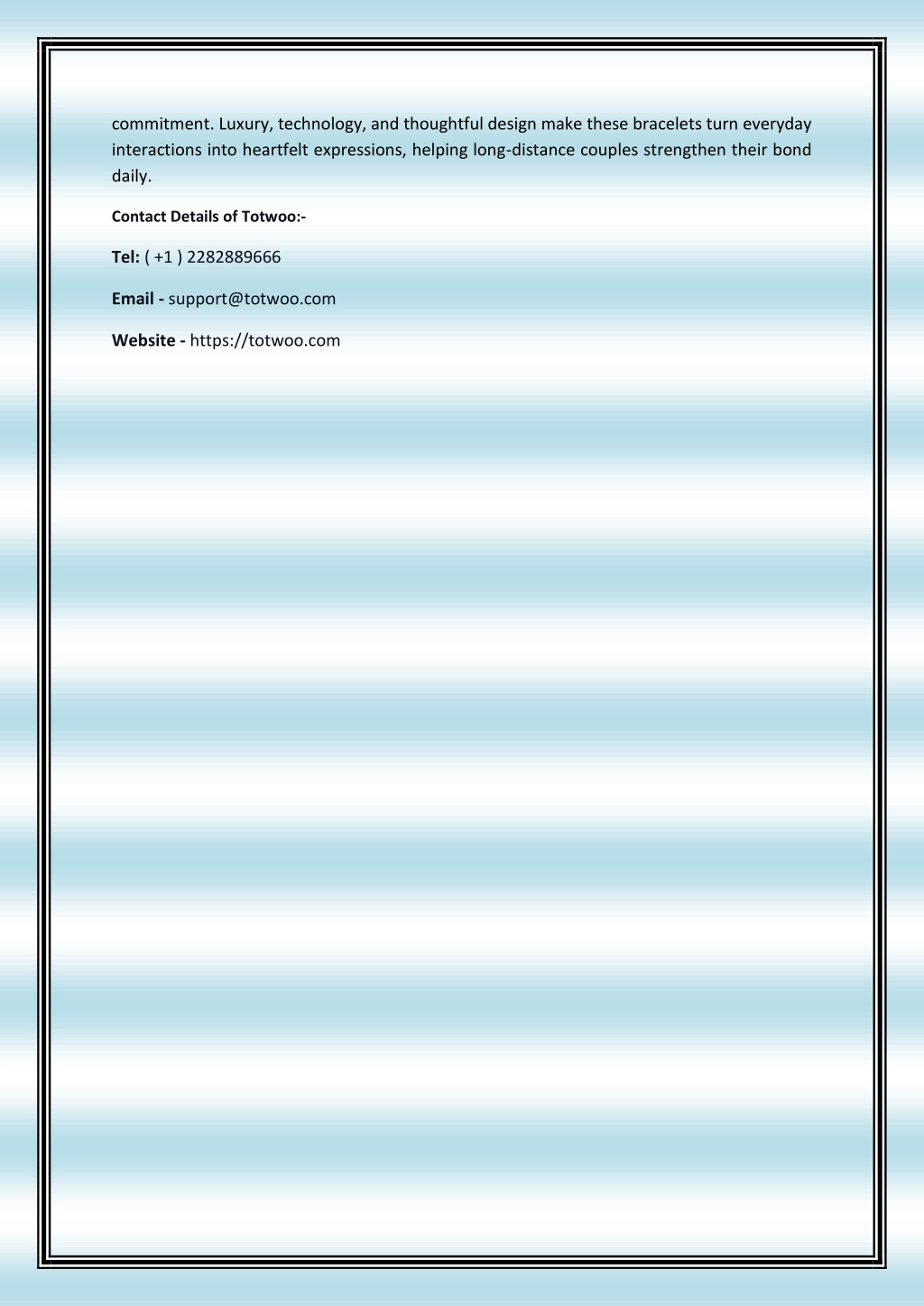 3. commitment. Luxury, technology, and thoughtful design make these bracelets turn everyday interactions into heartfelt expressions, helping long-distance couples strengthen their bond daily. Contact Details of Totwoo:- Tel: ( +1 ) 2282889666 Email - support@totwoo.com Website - https://totwoo.com