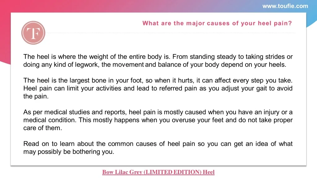 www.toufie.com What are the major causes of your heel pain? The heel is where the weight of the entire body is. From standing steady to taking strides or doing any kind of legwork, the movement and balance of your body depend on your heels. The heel is the largest bone in your foot, so when it hurts, it can affect every step you take. Heel pain can limit your activities and lead to referred pain as you adjust your gait to avoid the pain. As per medical studies and reports, heel pain is mostly caused when you have an injury or a medical condition. This mostly happens when you overuse your feet and do not take proper care of them. Read on to learn about the common causes of heel pain so you can get an idea of what may possibly be bothering you. Bow Lilac Grey (LIMITED EDITION) Heel