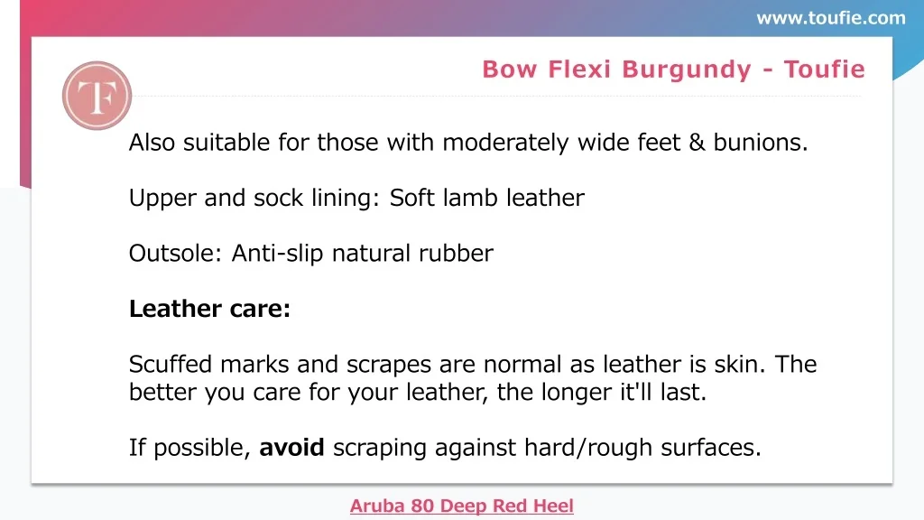 www.toufie.com Bow Flexi Burgundy - Toufie Also suitable for those with moderately wide feet & bunions. Upper and sock lining: Soft lamb leather Outsole: Anti-slip natural rubber Leather care: Scuffed marks and scrapes are normal as leather is skin. The better you care for your leather, the longer it'll last. If possible, avoid scraping against hard/rough surfaces. Aruba 80 Deep Red Heel