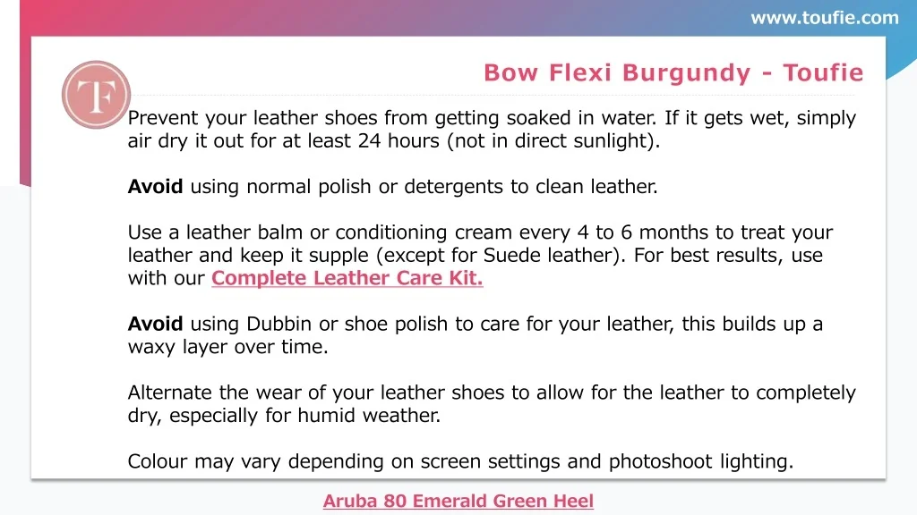 www.toufie.com Bow Flexi Burgundy - Toufie Prevent your leather shoes from getting soaked in water. If it gets wet, simply air dry it out for at least 24 hours (not in direct sunlight). Avoid using normal polish or detergents to clean leather. Use a leather balm or conditioning cream every 4 to 6 months to treat your leather and keep it supple (except for Suede leather). For best results, use with our Complete Leather Care Kit. Avoid using Dubbin or shoe polish to care for your leather, this builds up a waxy layer over time. Alternate the wear of your leather shoes to allow for the leather to completely dry, especially for humid weather. Colour may vary depending on screen settings and photoshoot lighting. Aruba 80 Emerald Green Heel