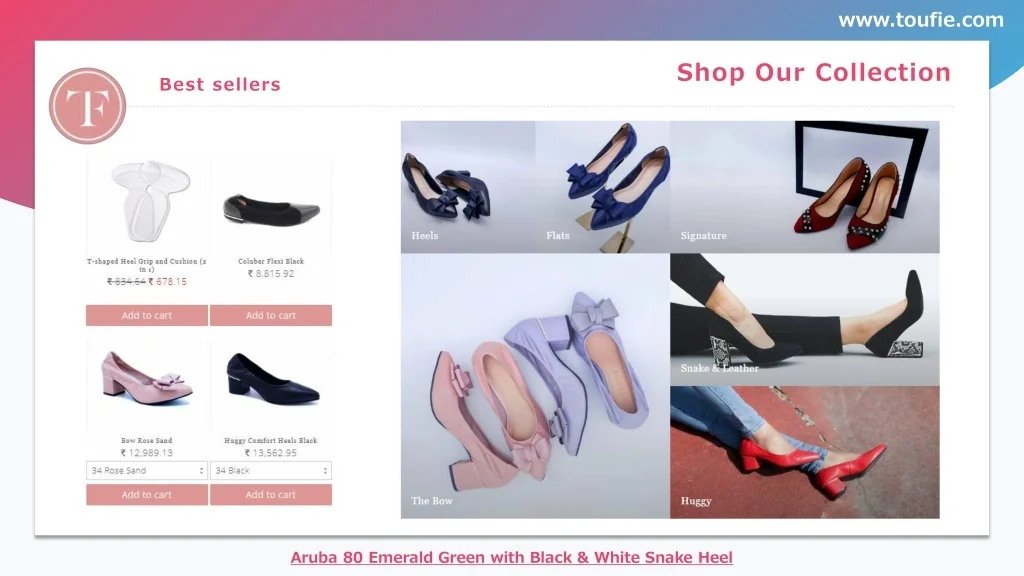www.toufie.com Shop Our Collection Best sellers Aruba 80 Emerald Green with Black & White Snake Heel