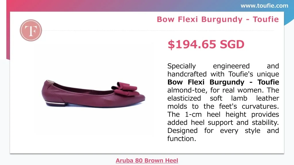 www.toufie.com Bow Flexi Burgundy - Toufie $194.65 SGD Specially handcrafted with Toufie's unique Bow Flexi Burgundy - Toufie almond-toe, for real women. The elasticized soft molds to the feet's curvatures. The 1-cm heel height provides added heel support and stability. Designed for every function. engineered and lamb leather style and Aruba 80 Brown Heel