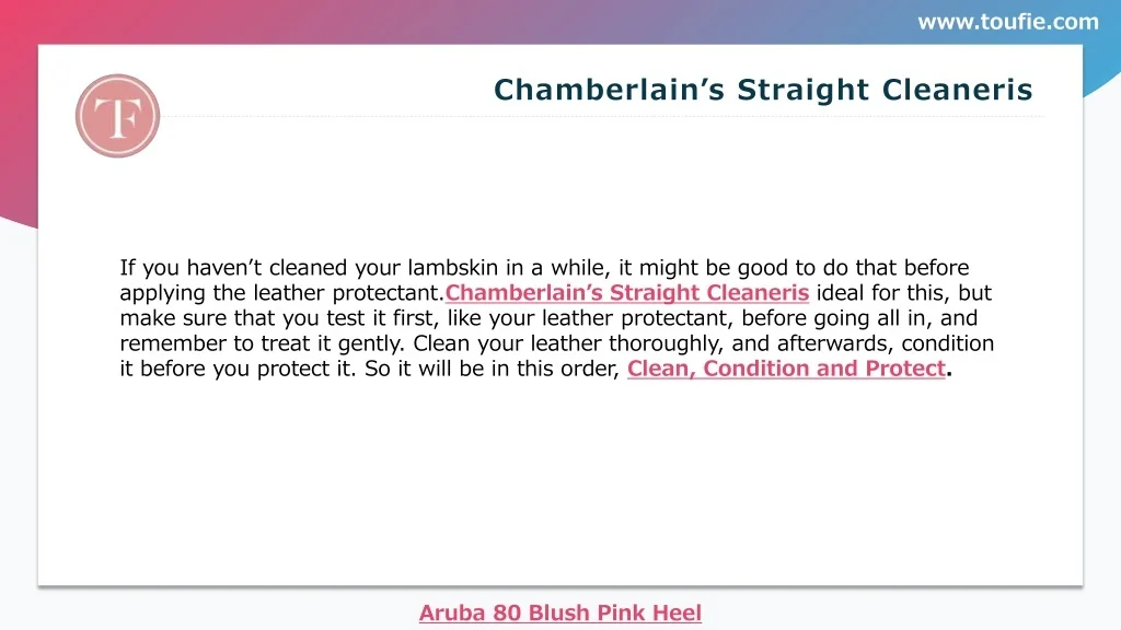 www.toufie.com Chamberlain’s Straight Cleaneris If you haven’t cleaned your lambskin in a while, it might be good to do that before applying the leather protectant.Chamberlain’s Straight Cleaneris ideal for this, but make sure that you test it first, like your leather protectant, before going all in, and remember to treat it gently. Clean your leather thoroughly, and afterwards, condition it before you protect it. So it will be in this order, Clean, Condition and Protect. Aruba 80 Blush Pink Heel