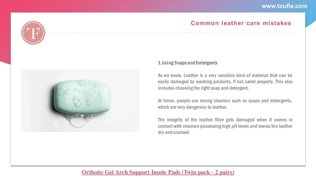 www.toufie.com Common leather care mistakes 1. 1.U Us si in ng g S So oa aps ps a an nd d D De et te er rg ge en nt ts s As we know, Leather is a very sensitive kind of material that can be easily damaged by washing products, if not cared properly. This also includes choosing the right soap and detergent. At times, people use strong cleaners such as soaps and detergents, which are very dangerous to leather. The integrity of the leather fibre gets damaged when it comes in contact with cleaners possessing high pH levels and leaves the leather dry and cracked. Orthotic Gel Arch Support Insole Pads (Twin pack - 2 pairs)