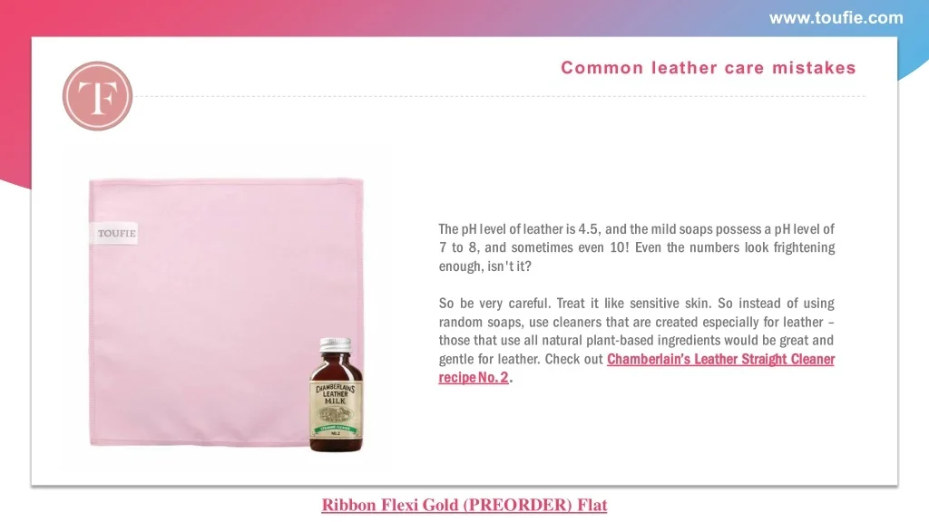 www.toufie.com Common leather care mistakes The pH level of leather is 4.5, and the mild soaps possess a pH level of 7 to 8, and sometimes even 10! Even the numbers look frightening enough, isn't it? So be very careful. Treat it like sensitive skin. So instead of using random soaps, use cleaners that are created especially for leather – those that use all natural plant-based ingredients would be great and gentle for leather. Check out C Ch ha am mb be er rl la ai in n’ ’s s L Le ea at th he er r S St tr ra ai ig gh ht t C Cl le ea an ne er r r re ec ci ipe pe No No. . 2 2. . Ribbon Flexi Gold (PREORDER) Flat