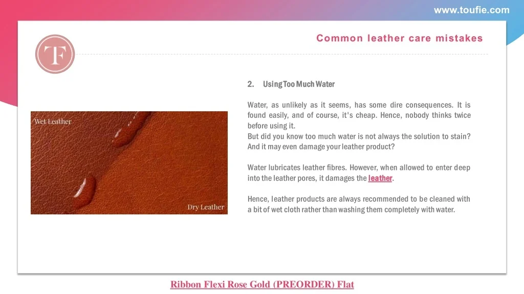 www.toufie.com Common leather care mistakes 2. 2. U Us si in ng g T To oo o M Mu uc ch h W Wa at te er r Water, as unlikely as it seems, has some dire consequences. It is found easily, and of course, it's cheap. Hence, nobody thinks twice before using it. But did you know too much water is not always the solution to stain? And it may even damage your leather product? Water lubricates leather fibres. However, when allowed to enter deep into the leather pores, it damages the l le ea at th he er r. Hence, leather products are always recommended to be cleaned with a bit of wet cloth rather than washing them completely with water. Ribbon Flexi Rose Gold (PREORDER) Flat