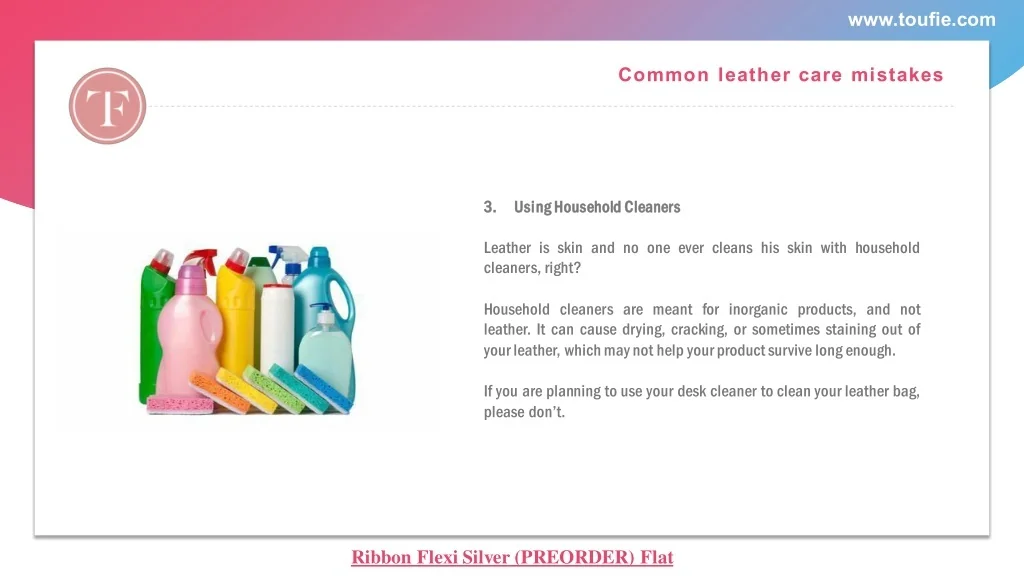 www.toufie.com Common leather care mistakes 3. 3. U Us si in ng g H Ho ou us se eh ho ol ld d C Cl le ea an ne er rs s Leather is skin and no one ever cleans his skin with household cleaners, right? Household cleaners are meant for inorganic products, and not leather. It can cause drying, cracking, or sometimes staining out of your leather, which may not help your product survive long enough. If you are planning to use your desk cleaner to clean your leather bag, please don’t. Ribbon Flexi Silver (PREORDER) Flat