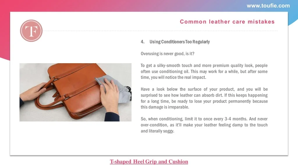 www.toufie.com Common leather care mistakes 4. 4. U Us si in ng g C Co on ndi dit ti io on ne er rs s T To oo o R Re eg gu ul la ar rl ly y Overusing is never good, is it? To get a silky-smooth touch and more premium quality look, people often use conditioning oil. This may work for a while, but after some time, you will notice the real impact. Have a look below the surface of your product, and you will be surprised to see how leather can absorb dirt. If this keeps happening for a long time, be ready to lose your product permanently because this damage is irreparable. So, when conditioning, limit it to once every 3-4 months. And never over-condition, as it’ll make your leather feeling damp to the touch and literally soggy. T-shaped Heel Grip and Cushion