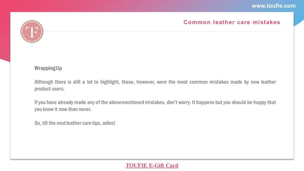 www.toufie.com Common leather care mistakes W Wr rap Although there is still a lot to highlight, these, however, were the most common mistakes made by new leather product users. If you have already made any of the abovementioned mistakes, don’t worry. It happens but you should be happy that you know it now than never. So, till the next leather care tips, adios! app pi ing ng U Up p TOUFIE E-Gift Card