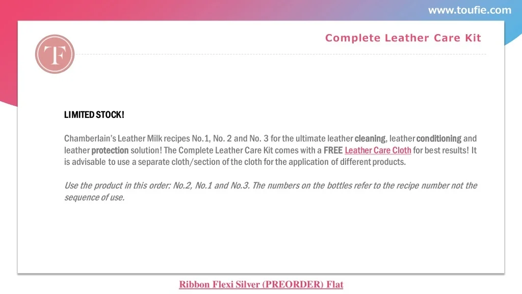 www.toufie.com Complete Leather Care Kit L LI IM MI ITED erson is viewing this. Chamberlain’s Leather Milk recipes No.1, No. 2 and No. 3 for the ultimate leather c cl le eani leather p pr rot ote ec ct ti ion on solution! The Complete Leather Care Kit comes with a F FR REE is advisable to use a separate cloth/section of the cloth for the application of different products. Use the product in this order: No.2, No.1 and No.3. The numbers on the bottles refer to the recipe number not the sequence of use. TED S ST TO OC CK K! ! 1 p aning ng, leather c con ond di it ti ioni oning ng and EE Leather Care Cloth for best results! It Ribbon Flexi Silver (PREORDER) Flat