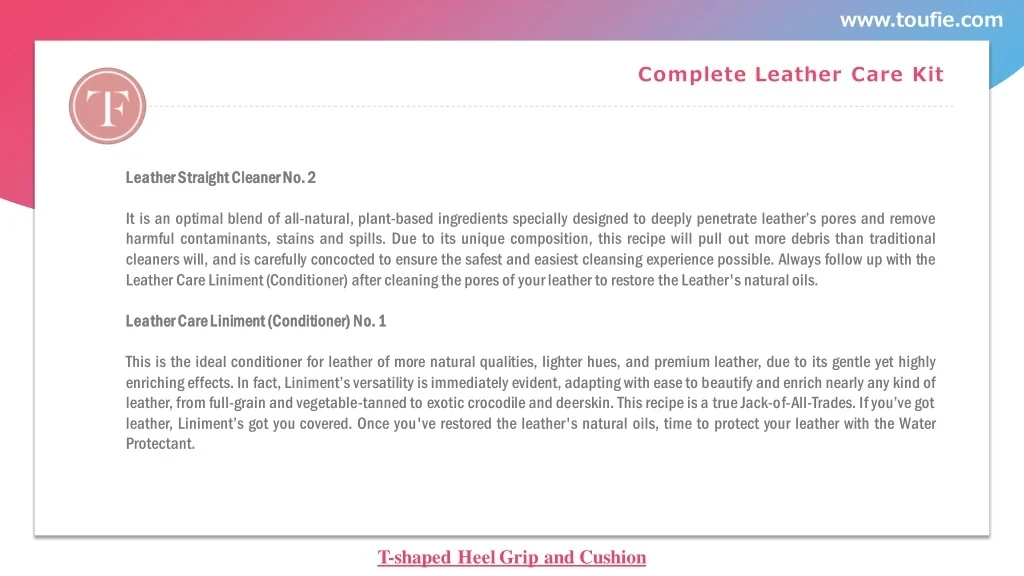 www.toufie.com Complete Leather Care Kit L Le ea at th he er r S St tr ra ai ig gh ht t C Cl le ea an ne er r No No. . 2 2 It is an optimal blend of all-natural, plant-based ingredients specially designed to deeply penetrate leather’s pores and remove harmful contaminants, stains and spills. Due to its unique composition, this recipe will pull out more debris than traditional cleaners will, and is carefully concocted to ensure the safest and easiest cleansing experience possible. Always follow up with the Leather Care Liniment (Conditioner) after cleaning the pores of your leather to restore the Leather's natural oils. L Le ea at th he er r C Ca ar re e L Li in ni im me en nt t ( (C Co on ndi dit ti io on ne er r) ) No No. . 1 1 This is the ideal conditioner for leather of more natural qualities, lighter hues, and premium leather, due to its gentle yet highly enriching effects. In fact, Liniment’s versatility is immediately evident, adapting with ease to beautify and enrich nearly any kind of leather, from full-grain and vegetable-tanned to exotic crocodile and deerskin. This recipe is a true Jack-of-All-Trades. If you’ve got leather, Liniment’s got you covered. Once you've restored the leather's natural oils, time to protect your leather with the Water Protectant. T-shaped Heel Grip and Cushion