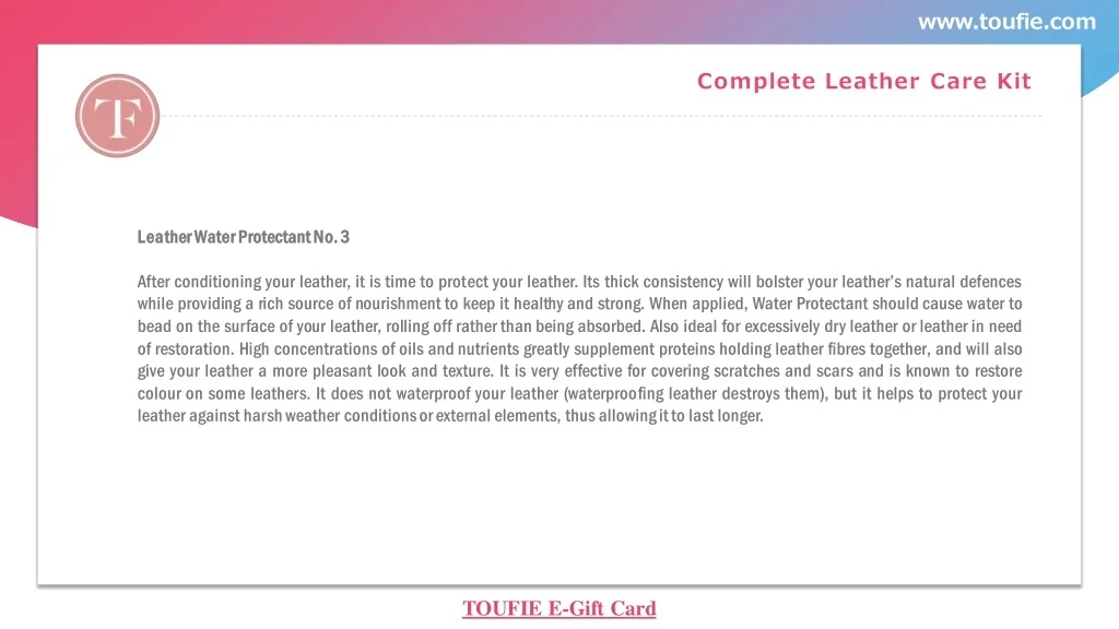 www.toufie.com Complete Leather Care Kit L Le ea at th he er r W Wa at te er r P Pr ro ot te ec ct ta an nt t No No. . 3 3 After conditioning your leather, it is time to protect your leather. Its thick consistency will bolster your leather’s natural defences while providing a rich source of nourishment to keep it healthy and strong. When applied, Water Protectant should cause water to bead on the surface of your leather, rolling off rather than being absorbed. Also ideal for excessively dry leather or leather in need of restoration. High concentrations of oils and nutrients greatly supplement proteins holding leather fibres together, and will also give your leather a more pleasant look and texture. It is very effective for covering scratches and scars and is known to restore colour on some leathers. It does not waterproof your leather (waterproofing leather destroys them), but it helps to protect your leather against harsh weather conditions or external elements, thus allowing it to last longer. TOUFIE E-Gift Card