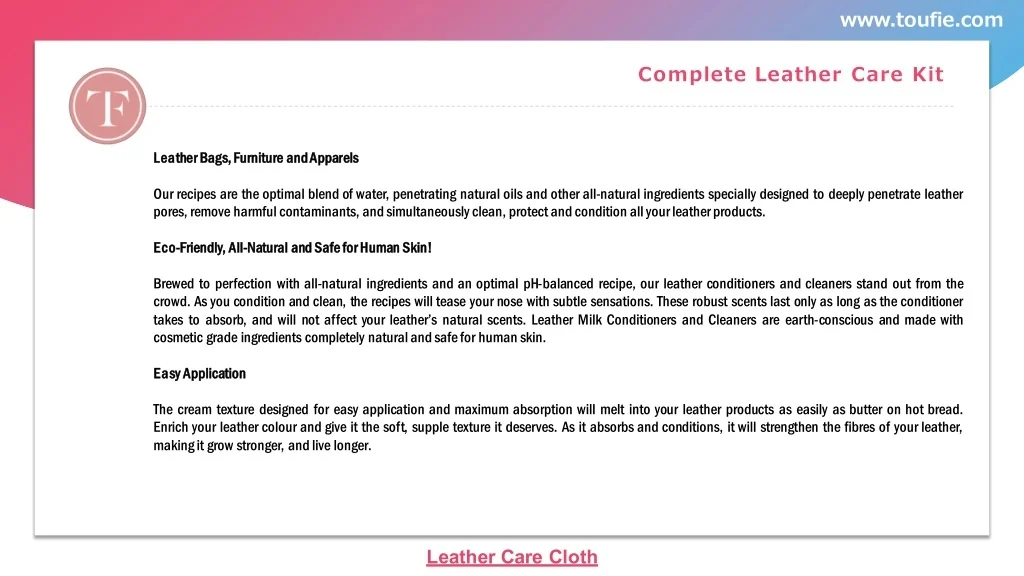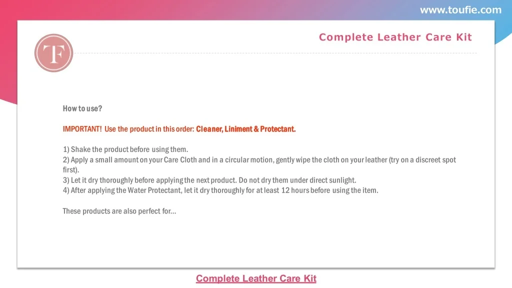 www.toufie.com Complete Leather Care Kit H Ho ow w t to o u us se e? ? IMPORTANT! Use the product in this order: C Cl le ea an ne er r, , L Li in ni im me en nt t & & P Pr ro ot te ec ct ta an nt t. . 1) Shake the product before using them. 2) Apply a small amount on your Care Cloth and in a circular motion, gently wipe the cloth on your leather (try on a discreet spot first). 3) Let it dry thoroughly before applying the next product. Do not dry them under direct sunlight. 4) After applying the Water Protectant, let it dry thoroughly for at least 12 hours before using the item. These products are also perfect for... Complete Leather Care Kit