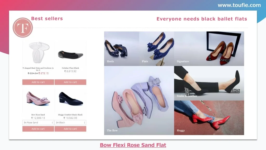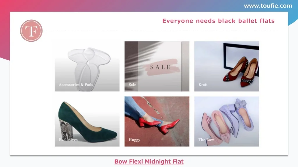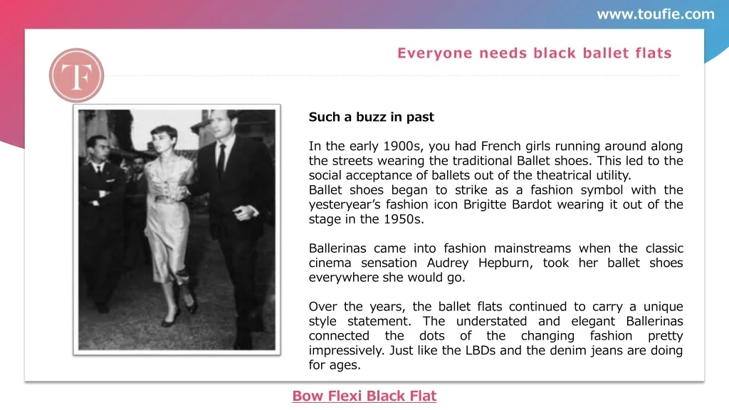www.toufie.com Everyone needs black ballet flats Such a buzz in past In the early 1900s, you had French girls running around along the streets wearing the traditional Ballet shoes. This led to the social acceptance of ballets out of the theatrical utility. Ballet shoes began to strike as a fashion symbol with the yesteryear’s fashion icon Brigitte Bardot wearing it out of the stage in the 1950s. Ballerinas came into fashion mainstreams when the classic cinema sensation Audrey Hepburn, took her ballet shoes everywhere she would go. Over the years, the ballet flats continued to carry a unique style statement. The understated connected the dots of the impressively. Just like the LBDs and the denim jeans are doing for ages. and elegant Ballerinas changing fashion pretty Bow Flexi Black Flat