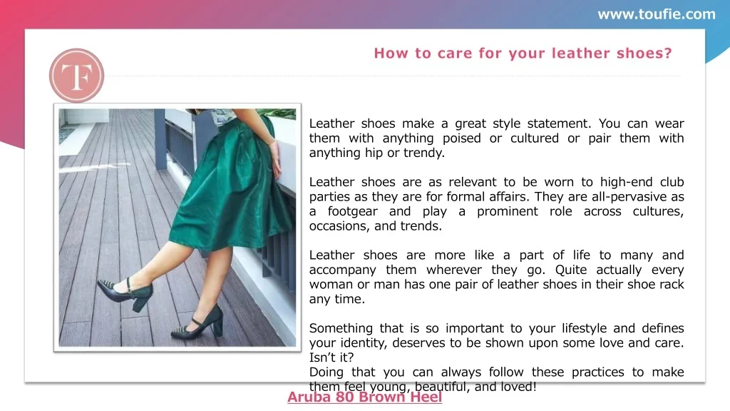 www.toufie.com How to care for your leather shoes? Leather shoes make a great style statement. You can wear them with anything poised or cultured or pair them with anything hip or trendy. Leather shoes are as relevant to be worn to high-end club parties as they are for formal affairs. They are all-pervasive as a footgear and play a prominent occasions, and trends. role across cultures, Leather shoes are more like a part of life to many and accompany them wherever they go. Quite actually every woman or man has one pair of leather shoes in their shoe rack any time. Something that is so important to your lifestyle and defines your identity, deserves to be shown upon some love and care. Isn’t it? Doing that you can always follow these practices to make them feel young, beautiful, and loved! Aruba 80 Brown Heel