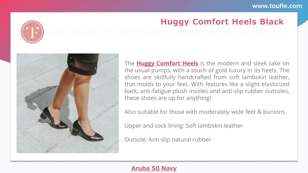 www.toufie.com Huggy Comfort Heels Black The Huggy Comfort Heels is the modern and sleek take on the usual pumps, with a touch of gold luxury in its heels. The shoes are skillfully handcrafted from soft lambskin leather, that molds to your feet. With features like a slight elasticized back, anti-fatigue plush insoles and anti-slip rubber outsoles, these shoes are up for anything! Also suitable for those with moderately wide feet & bunions. Upper and sock lining: Soft lambskin leather Outsole: Anti-slip natural rubber Aruba 50 Navy
