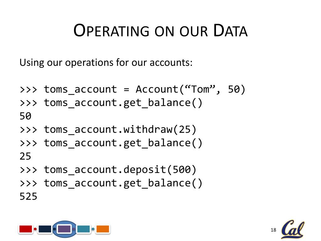 Operating on our Data Using our operations for our accounts: >>> toms_account = Account(“Tom”, 50) >>> toms_account.get_balance() 50 >>> toms_account.withdraw(25) >>> toms_account.get_balance() 25 >>> toms_account.deposit(500) >>> toms_account.get_balance() 525