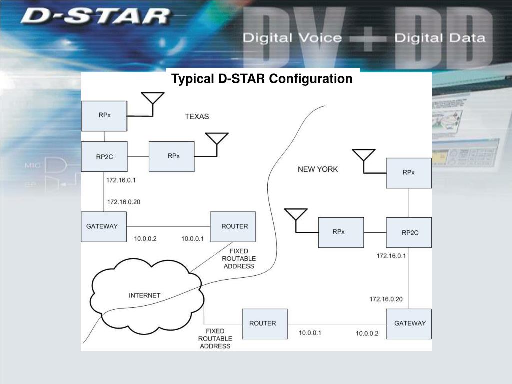 Why is D-STAR interesting? • Digital packet carries both Digital Voice and concurrent Data Stream • Radios automatically transmit call sign along with the voice communications, and it is displayed on all receiving stations screens • No need to Voice ID since the call sign is sent with each transmission (Even though you don’t need to voice ID to be legal on D-Star, it is still a good operating practice to do so) • GPS location transmitted along with voice communications • Wide Area Networking with Digital Data (DD) that can be sent in high-volume while traditional modes are slow • Can dispatch assets accurately and place data in the hands of those who need it the most – fast image, text and document data exchanges