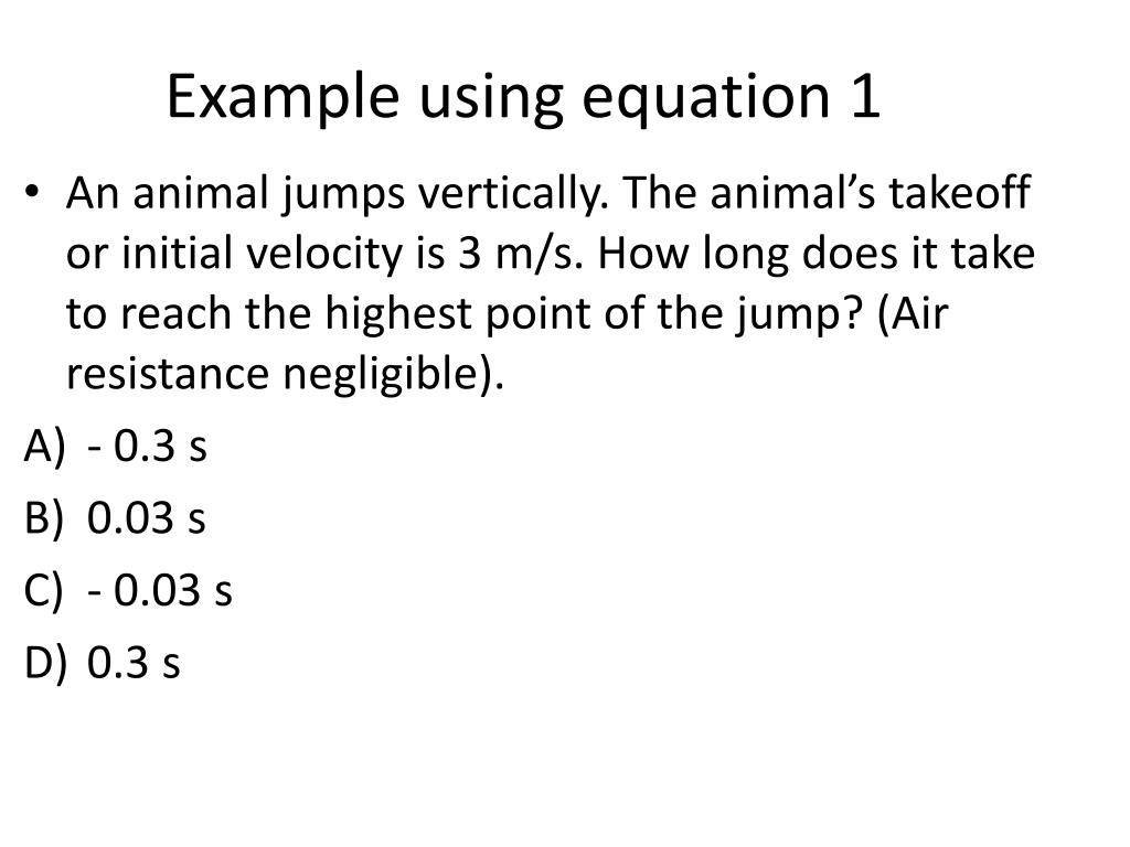 Example using equation 1 • An animal jumps vertically. The animal’s takeoff or initial velocity is 3 m/s. How long does it take to reach the highest point of the jump? (Air resistance negligible). • - 0.3 s • 0.03 s • - 0.03 s • 0.3 s