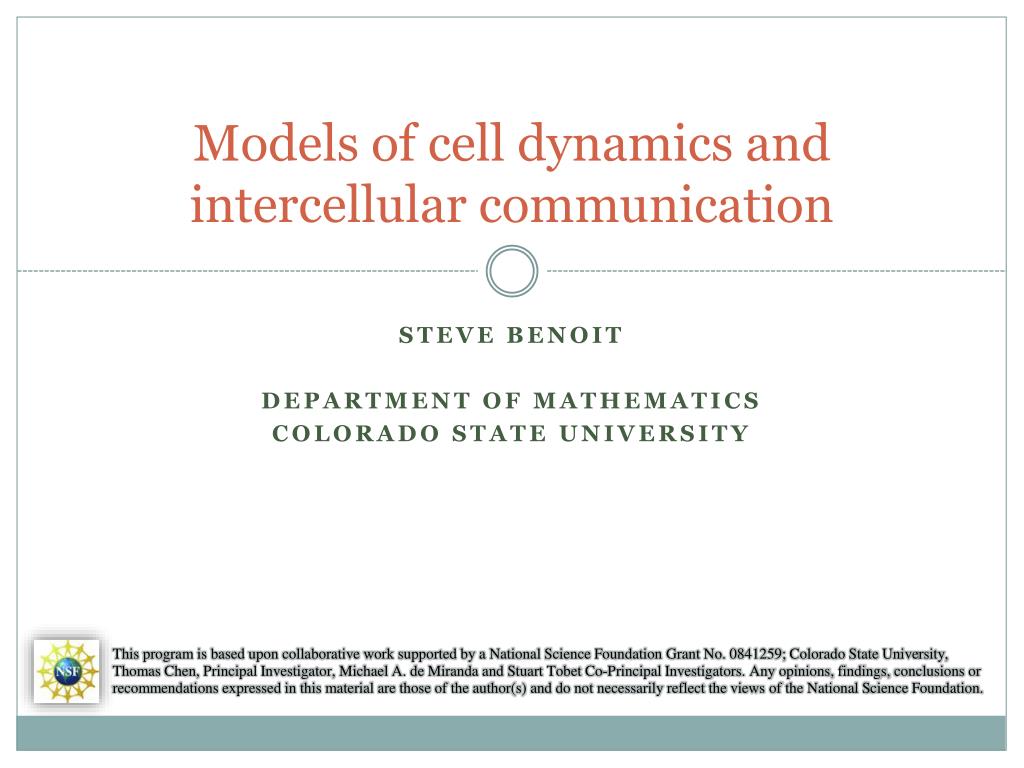Models of cell dynamics andintercellular communication Steve Benoit Department of Mathematics Colorado State University This program is based upon collaborative work supported by a National Science Foundation Grant No. 0841259; Colorado State University, Thomas Chen, Principal Investigator, Michael A. de Miranda and Stuart Tobet Co-Principal Investigators. Any opinions, findings, conclusions or recommendations expressed in this material are those of the author(s) and do not necessarily reflect the views of the National Science Foundation.