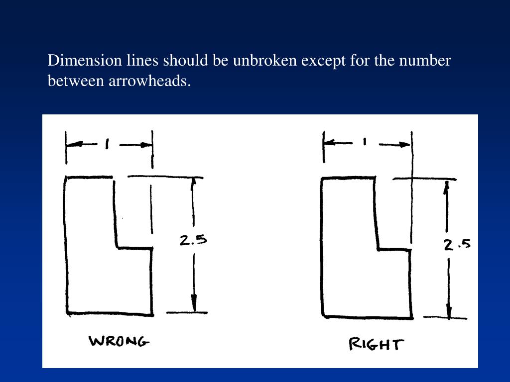There should be a visible gap between the object and the extension line. Extension lines should extend past the last dimension line.