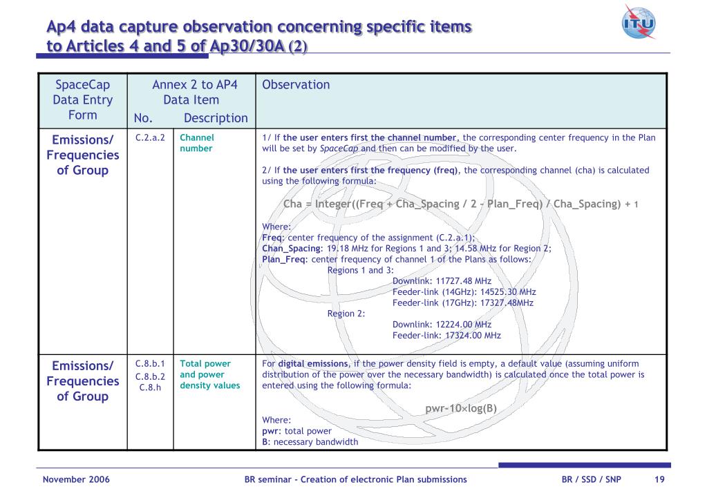 Ap30/30A - Data organization in the SpaceCap software (2) Emission characteristics of a specific group (frequencies, power and modulation characteristics) Service area, test points and typical earth station antenna characteristics of a specific group Specific earth station antenna characteristics of a certain group in the case of feeder-link only (if any) BR seminar - Creation of electronic Plan submissions