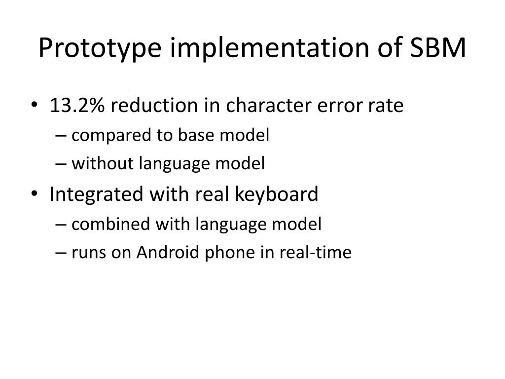 Prototype implementation of SBM • 13.2% reduction in character error rate • compared to base model • without language model • Integrated with real keyboard • combined with language model • runs on Android phone in real-time