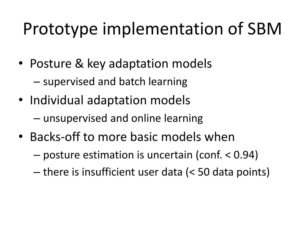 Prototype implementation of SBM • Posture & key adaptation models • supervised and batch learning • Individual adaptation models • unsupervised and online learning • Backs-off to more basic models when • posture estimation is uncertain (conf. < 0.94) • there is insufficient user data (< 50 data points)