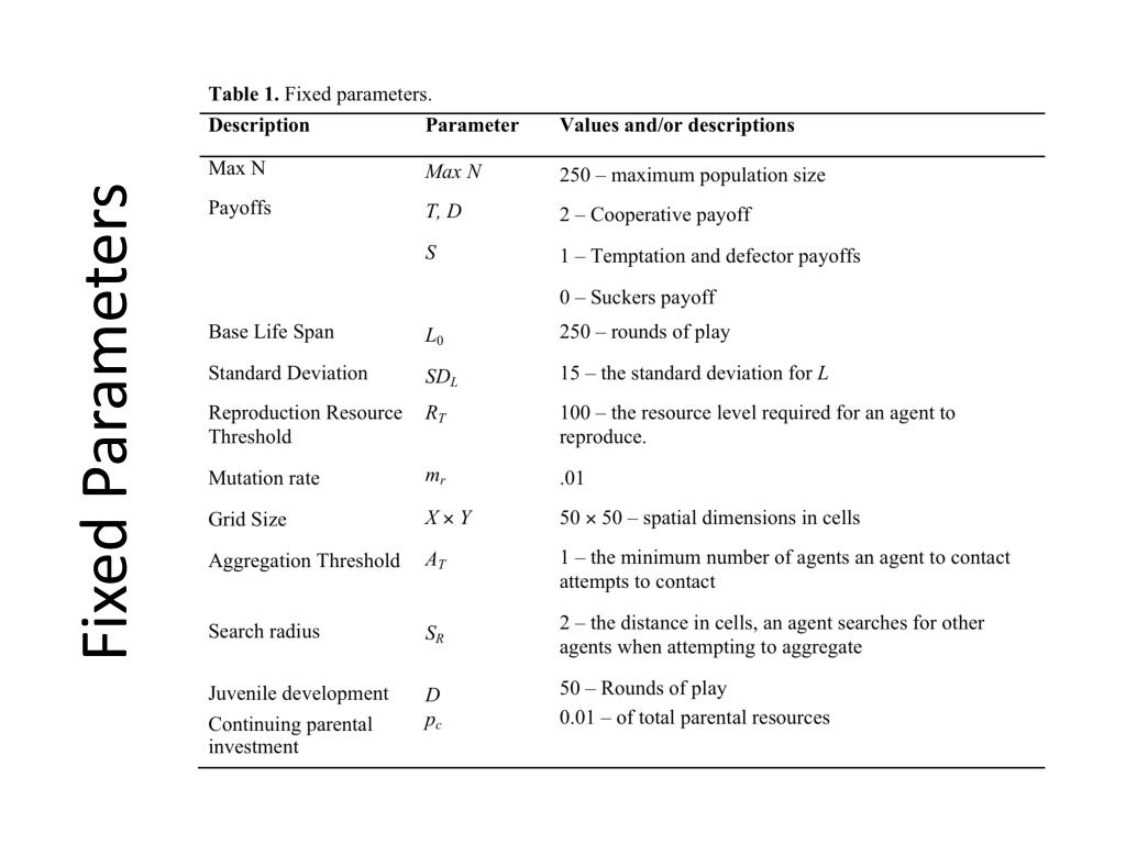 A Model of the Evolution of Social Play • Sometimes intuitions can be misleading! • Let’s consider agents with generic biological properties characteristic of animals that engage in social play and adult cooperation • Agents can • Movement and Aggregation • Development (juvenile adult) • Learning • Reproduction • Parental investment • Life span • Foraging for resources
