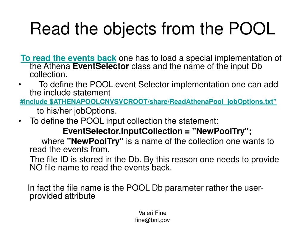 Read the objects from the POOL To read the events backone has to load a special implementation of the Athena EventSelector class and the name of the input Db collection. • To define the POOL event Selector implementation one can add the include statement #include $ATHENAPOOLCNVSVCROOT/share/ReadAthenaPool_jobOptions.txt" to his/her jobOptions. • To define the POOL input collection the statement: EventSelector.InputCollection = "NewPoolTry"; where "NewPoolTry" is a name of the collection one wants to read the events from. The file ID is stored in the Db. By this reason one needs to provide NO file name to read the events back. In fact the file name is the POOL Db parameter rather the user-provided attribute Valeri Fine fine@bnl.gov